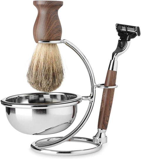 Consta d'una navalla, un raspall d'afaitar amb truges de gran qualitat i un pràctic suport amb bol.