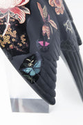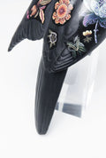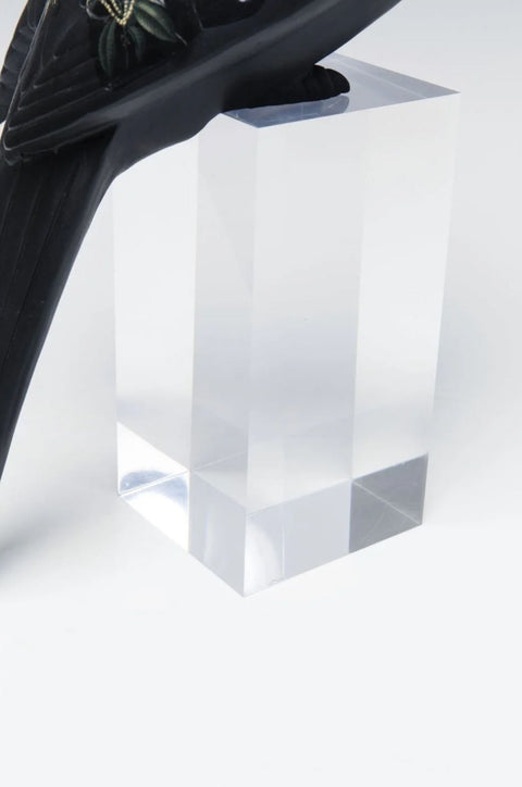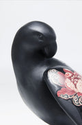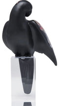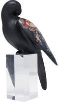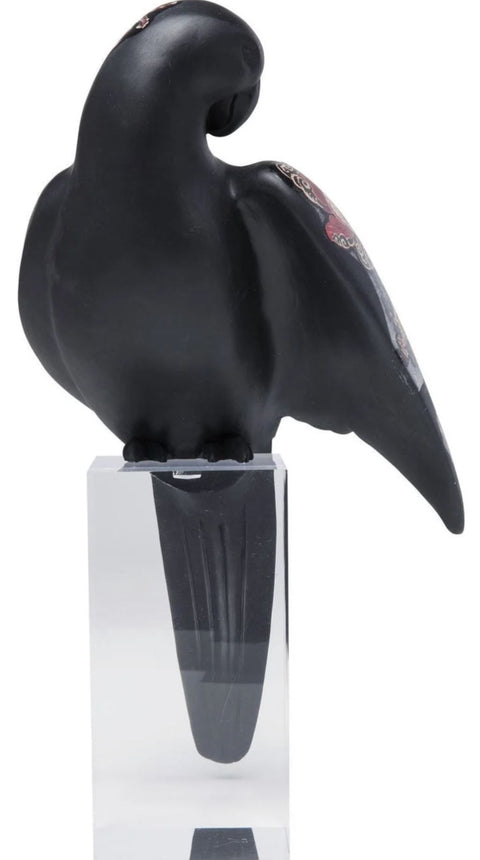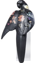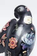 Scultura di pappagallo nero con tatuaggio floreale in acrilico e poliresine.